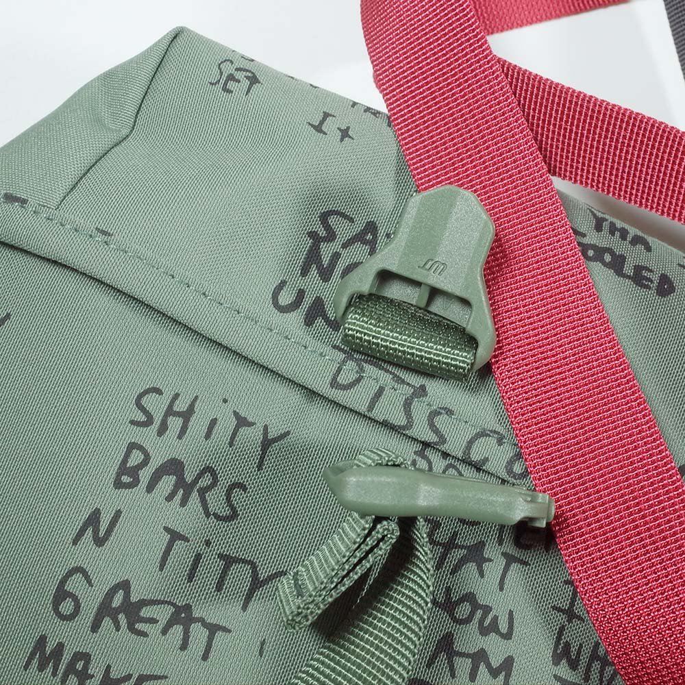 - Features a main compartment with top flap and buckle closure. Adjustable shoulder strap.